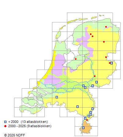 Het aantal atlasblokken (5x5 km) waarin de soort is gemeld binnen een periode van vijf jaar (vanaf 1980) of twintig jaar. Niet gecorrigeerd voor waarnemersinspanning en het aantal doorgegeven waarnemingen kan sterk variëren per periode, dus een trend in verspreiding kan hier niet direct uit worden afgelezen. Het opgegeven jaartal is het eerste jaar van de periode. Bron: gevalideerde waarnemingen uit de NDFF.
