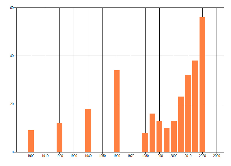 Het aantal atlasblokken (5x5 km) waarin de soort is gemeld binnen een periode van vijf jaar (vanaf 1980) of twintig jaar. Niet gecorrigeerd voor waarnemersinspanning en het aantal doorgegeven waarnemingen kan sterk variëren per periode, dus een trend in verspreiding kan hier niet direct uit worden afgelezen. Het opgegeven jaartal is het eerste jaar van de periode. Bron: gevalideerde waarnemingen uit de NDFF.