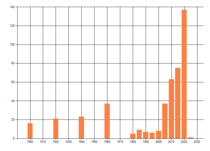 Het aantal atlasblokken (5x5 km) waarin de soort is gemeld binnen een periode van vijf jaar (vanaf 1980) of twintig jaar. Niet gecorrigeerd voor waarnemersinspanning en het aantal doorgegeven waarnemingen kan sterk variëren per periode, dus een trend in verspreiding kan hier niet direct uit worden afgelezen. Het opgegeven jaartal is het eerste jaar van de periode. Bron: gevalideerde waarnemingen uit de NDFF.