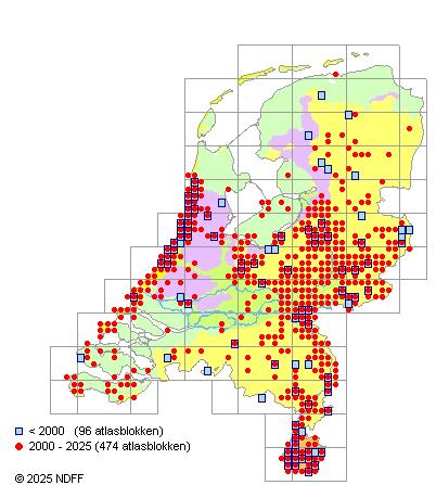 Het aantal atlasblokken (5x5 km) waarin de soort is gemeld binnen een periode van vijf jaar (vanaf 1980) of twintig jaar. Niet gecorrigeerd voor waarnemersinspanning en het aantal doorgegeven waarnemingen kan sterk variëren per periode, dus een trend in verspreiding kan hier niet direct uit worden afgelezen. Het opgegeven jaartal is het eerste jaar van de periode. Bron: gevalideerde waarnemingen uit de NDFF.