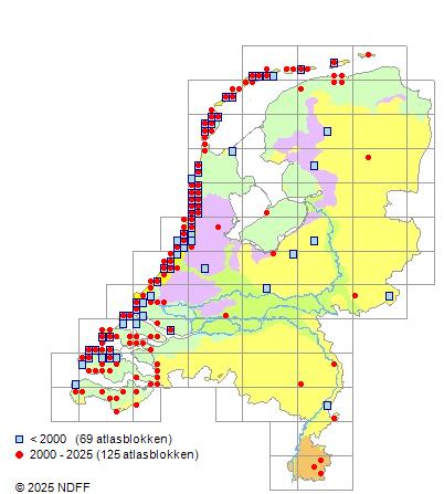 Het aantal atlasblokken (5x5 km) waarin de soort is gemeld binnen een periode van vijf jaar (vanaf 1980) of twintig jaar. Niet gecorrigeerd voor waarnemersinspanning en het aantal doorgegeven waarnemingen kan sterk variëren per periode, dus een trend in verspreiding kan hier niet direct uit worden afgelezen. Het opgegeven jaartal is het eerste jaar van de periode. Bron: gevalideerde waarnemingen uit de NDFF.