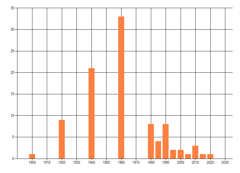 Het aantal atlasblokken (5x5 km) waarin de soort is gemeld binnen een periode van vijf jaar (vanaf 1980) of twintig jaar. Niet gecorrigeerd voor waarnemersinspanning en het aantal doorgegeven waarnemingen kan sterk variëren per periode, dus een trend in verspreiding kan hier niet direct uit worden afgelezen. Het opgegeven jaartal is het eerste jaar van de periode. Bron: gevalideerde waarnemingen uit de NDFF.