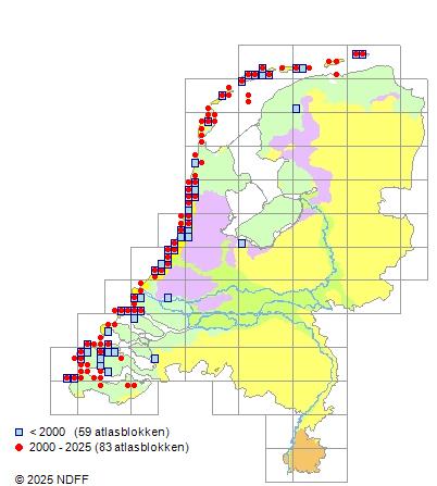 Het aantal atlasblokken (5x5 km) waarin de soort is gemeld binnen een periode van vijf jaar (vanaf 1980) of twintig jaar. Niet gecorrigeerd voor waarnemersinspanning en het aantal doorgegeven waarnemingen kan sterk variëren per periode, dus een trend in verspreiding kan hier niet direct uit worden afgelezen. Het opgegeven jaartal is het eerste jaar van de periode. Bron: gevalideerde waarnemingen uit de NDFF.