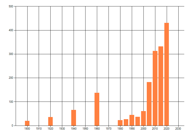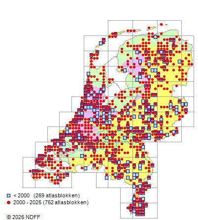 Het aantal atlasblokken (5x5 km) waarin de soort is gemeld binnen een periode van vijf jaar (vanaf 1980) of twintig jaar. Niet gecorrigeerd voor waarnemersinspanning en het aantal doorgegeven waarnemingen kan sterk variëren per periode, dus een trend in verspreiding kan hier niet direct uit worden afgelezen. Het opgegeven jaartal is het eerste jaar van de periode. Bron: gevalideerde waarnemingen uit de NDFF.