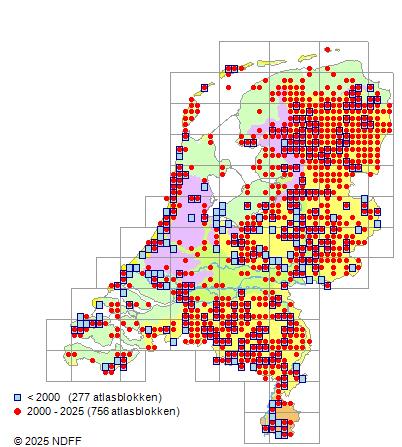 Het aantal atlasblokken (5x5 km) waarin de soort is gemeld binnen een periode van vijf jaar (vanaf 1980) of twintig jaar. Niet gecorrigeerd voor waarnemersinspanning en het aantal doorgegeven waarnemingen kan sterk variëren per periode, dus een trend in verspreiding kan hier niet direct uit worden afgelezen. Het opgegeven jaartal is het eerste jaar van de periode. Bron: gevalideerde waarnemingen uit de NDFF.