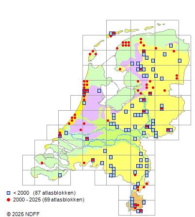 Het aantal atlasblokken (5x5 km) waarin de soort is gemeld binnen een periode van vijf jaar (vanaf 1980) of twintig jaar. Niet gecorrigeerd voor waarnemersinspanning en het aantal doorgegeven waarnemingen kan sterk variëren per periode, dus een trend in verspreiding kan hier niet direct uit worden afgelezen. Het opgegeven jaartal is het eerste jaar van de periode. Bron: gevalideerde waarnemingen uit de NDFF.