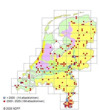 Het aantal atlasblokken (5x5 km) waarin de soort is gemeld binnen een periode van vijf jaar (vanaf 1980) of twintig jaar. Niet gecorrigeerd voor waarnemersinspanning en het aantal doorgegeven waarnemingen kan sterk variëren per periode, dus een trend in verspreiding kan hier niet direct uit worden afgelezen. Het opgegeven jaartal is het eerste jaar van de periode. Bron: gevalideerde waarnemingen uit de NDFF.