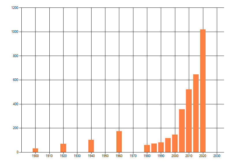 Het aantal atlasblokken (5x5 km) waarin de soort is gemeld binnen een periode van vijf jaar (vanaf 1980) of twintig jaar. Niet gecorrigeerd voor waarnemersinspanning en het aantal doorgegeven waarnemingen kan sterk variëren per periode, dus een trend in verspreiding kan hier niet direct uit worden afgelezen. Het opgegeven jaartal is het eerste jaar van de periode. Bron: gevalideerde waarnemingen uit de NDFF.
