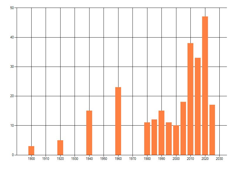 Het aantal atlasblokken (5x5 km) waarin de soort is gemeld binnen een periode van vijf jaar (vanaf 1980) of twintig jaar. Niet gecorrigeerd voor waarnemersinspanning en het aantal doorgegeven waarnemingen kan sterk variëren per periode, dus een trend in verspreiding kan hier niet direct uit worden afgelezen. Het opgegeven jaartal is het eerste jaar van de periode. Bron: gevalideerde waarnemingen uit de NDFF.