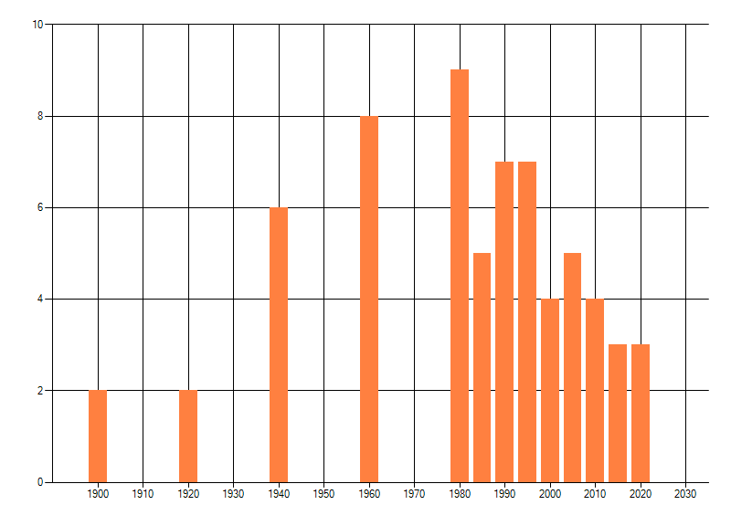 Het aantal atlasblokken (5x5 km) waarin de soort is gemeld binnen een periode van vijf jaar (vanaf 1980) of twintig jaar. Niet gecorrigeerd voor waarnemersinspanning en het aantal doorgegeven waarnemingen kan sterk variëren per periode, dus een trend in verspreiding kan hier niet direct uit worden afgelezen. Het opgegeven jaartal is het eerste jaar van de periode. Bron: gevalideerde waarnemingen uit de NDFF.