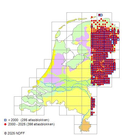Het aantal atlasblokken (5x5 km) waarin de soort is gemeld binnen een periode van vijf jaar (vanaf 1980) of twintig jaar. Niet gecorrigeerd voor waarnemersinspanning en het aantal doorgegeven waarnemingen kan sterk variëren per periode, dus een trend in verspreiding kan hier niet direct uit worden afgelezen. Het opgegeven jaartal is het eerste jaar van de periode. Bron: gevalideerde waarnemingen uit de NDFF.