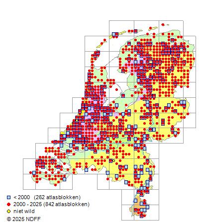Het aantal atlasblokken (5x5 km) waarin de soort is gemeld binnen een periode van vijf jaar (vanaf 1980) of twintig jaar. Niet gecorrigeerd voor waarnemersinspanning en het aantal doorgegeven waarnemingen kan sterk variëren per periode, dus een trend in verspreiding kan hier niet direct uit worden afgelezen. Het opgegeven jaartal is het eerste jaar van de periode. Bron: gevalideerde waarnemingen uit de NDFF.