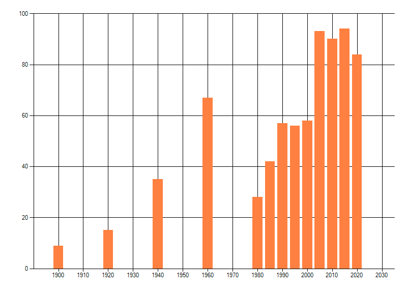 Het aantal atlasblokken (5x5 km) waarin de soort is gemeld binnen een periode van vijf jaar (vanaf 1980) of twintig jaar. Niet gecorrigeerd voor waarnemersinspanning en het aantal doorgegeven waarnemingen kan sterk variëren per periode, dus een trend in verspreiding kan hier niet direct uit worden afgelezen. Het opgegeven jaartal is het eerste jaar van de periode. Bron: gevalideerde waarnemingen uit de NDFF.
