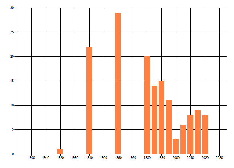 Het aantal atlasblokken (5x5 km) waarin de soort is gemeld binnen een periode van vijf jaar (vanaf 1980) of twintig jaar. Niet gecorrigeerd voor waarnemersinspanning en het aantal doorgegeven waarnemingen kan sterk variëren per periode, dus een trend in verspreiding kan hier niet direct uit worden afgelezen. Het opgegeven jaartal is het eerste jaar van de periode. Bron: gevalideerde waarnemingen uit de NDFF.