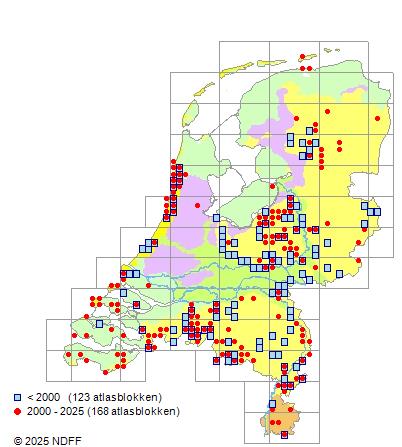 Het aantal atlasblokken (5x5 km) waarin de soort is gemeld binnen een periode van vijf jaar (vanaf 1980) of twintig jaar. Niet gecorrigeerd voor waarnemersinspanning en het aantal doorgegeven waarnemingen kan sterk variëren per periode, dus een trend in verspreiding kan hier niet direct uit worden afgelezen. Het opgegeven jaartal is het eerste jaar van de periode. Bron: gevalideerde waarnemingen uit de NDFF.