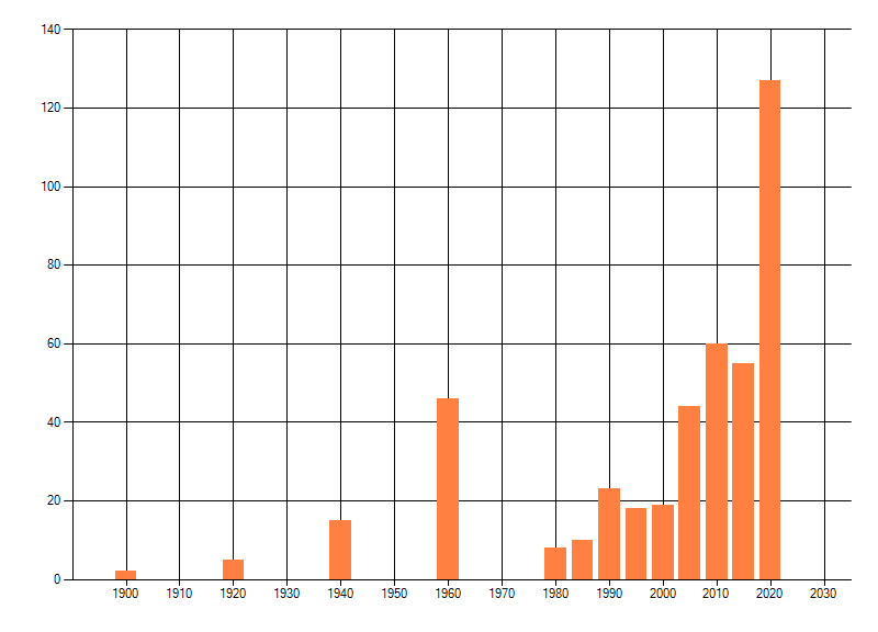 Het aantal atlasblokken (5x5 km) waarin de soort is gemeld binnen een periode van vijf jaar (vanaf 1980) of twintig jaar. Niet gecorrigeerd voor waarnemersinspanning en het aantal doorgegeven waarnemingen kan sterk variëren per periode, dus een trend in verspreiding kan hier niet direct uit worden afgelezen. Het opgegeven jaartal is het eerste jaar van de periode. Bron: gevalideerde waarnemingen uit de NDFF.