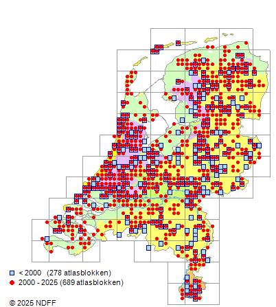 Het aantal atlasblokken (5x5 km) waarin de soort is gemeld binnen een periode van vijf jaar (vanaf 1980) of twintig jaar. Niet gecorrigeerd voor waarnemersinspanning en het aantal doorgegeven waarnemingen kan sterk variëren per periode, dus een trend in verspreiding kan hier niet direct uit worden afgelezen. Het opgegeven jaartal is het eerste jaar van de periode. Bron: gevalideerde waarnemingen uit de NDFF.