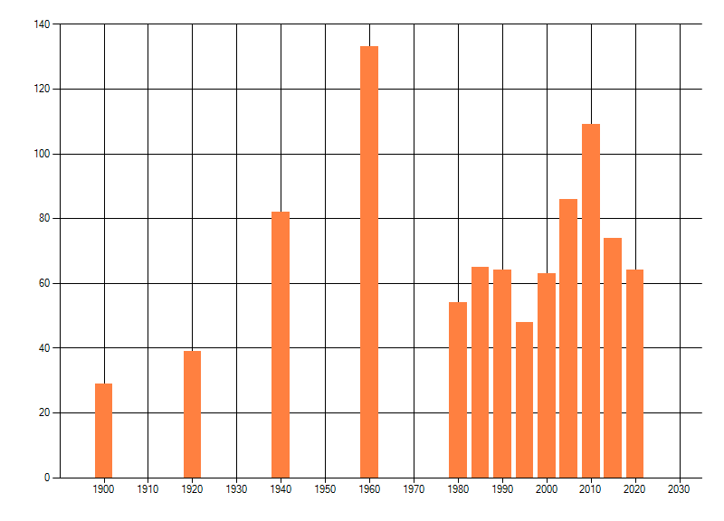 Het aantal atlasblokken (5x5 km) waarin de soort is gemeld binnen een periode van vijf jaar (vanaf 1980) of twintig jaar. Niet gecorrigeerd voor waarnemersinspanning en het aantal doorgegeven waarnemingen kan sterk variëren per periode, dus een trend in verspreiding kan hier niet direct uit worden afgelezen. Het opgegeven jaartal is het eerste jaar van de periode. Bron: gevalideerde waarnemingen uit de NDFF.
