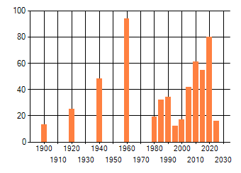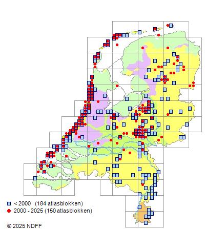 Het aantal atlasblokken (5x5 km) waarin de soort is gemeld binnen een periode van vijf jaar (vanaf 1980) of twintig jaar. Niet gecorrigeerd voor waarnemersinspanning en het aantal doorgegeven waarnemingen kan sterk variëren per periode, dus een trend in verspreiding kan hier niet direct uit worden afgelezen. Het opgegeven jaartal is het eerste jaar van de periode. Bron: gevalideerde waarnemingen uit de NDFF.
