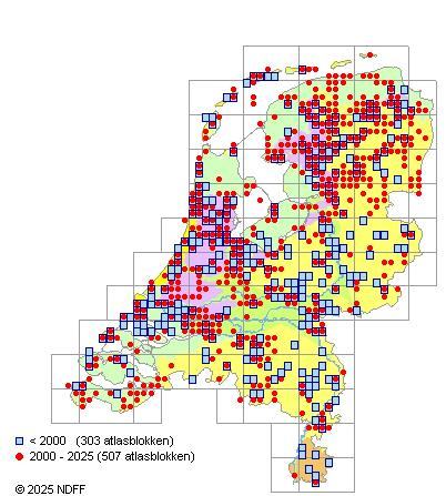 Het aantal atlasblokken (5x5 km) waarin de soort is gemeld binnen een periode van vijf jaar (vanaf 1980) of twintig jaar. Niet gecorrigeerd voor waarnemersinspanning en het aantal doorgegeven waarnemingen kan sterk variëren per periode, dus een trend in verspreiding kan hier niet direct uit worden afgelezen. Het opgegeven jaartal is het eerste jaar van de periode. Bron: gevalideerde waarnemingen uit de NDFF.