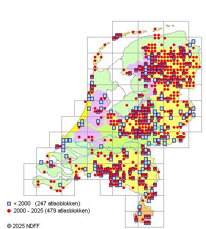 Het aantal atlasblokken (5x5 km) waarin de soort is gemeld binnen een periode van vijf jaar (vanaf 1980) of twintig jaar. Niet gecorrigeerd voor waarnemersinspanning en het aantal doorgegeven waarnemingen kan sterk variëren per periode, dus een trend in verspreiding kan hier niet direct uit worden afgelezen. Het opgegeven jaartal is het eerste jaar van de periode. Bron: gevalideerde waarnemingen uit de NDFF.