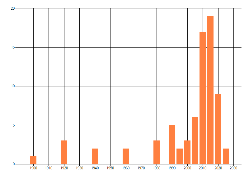 Het aantal atlasblokken (5x5 km) waarin de soort is gemeld binnen een periode van vijf jaar (vanaf 1980) of twintig jaar. Niet gecorrigeerd voor waarnemersinspanning en het aantal doorgegeven waarnemingen kan sterk variëren per periode, dus een trend in verspreiding kan hier niet direct uit worden afgelezen. Het opgegeven jaartal is het eerste jaar van de periode. Bron: gevalideerde waarnemingen uit de NDFF.