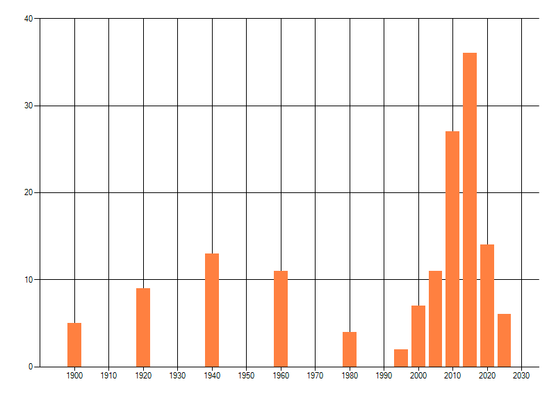 Het aantal atlasblokken (5x5 km) waarin de soort is gemeld binnen een periode van vijf jaar (vanaf 1980) of twintig jaar. Niet gecorrigeerd voor waarnemersinspanning en het aantal doorgegeven waarnemingen kan sterk variëren per periode, dus een trend in verspreiding kan hier niet direct uit worden afgelezen. Het opgegeven jaartal is het eerste jaar van de periode. Bron: gevalideerde waarnemingen uit de NDFF.