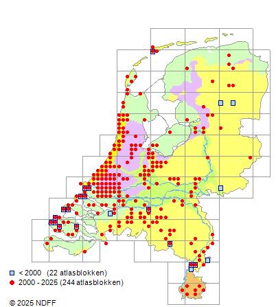 Het aantal atlasblokken (5x5 km) waarin de soort is gemeld binnen een periode van vijf jaar (vanaf 1980) of twintig jaar. Niet gecorrigeerd voor waarnemersinspanning en het aantal doorgegeven waarnemingen kan sterk variëren per periode, dus een trend in verspreiding kan hier niet direct uit worden afgelezen. Het opgegeven jaartal is het eerste jaar van de periode. Bron: gevalideerde waarnemingen uit de NDFF.