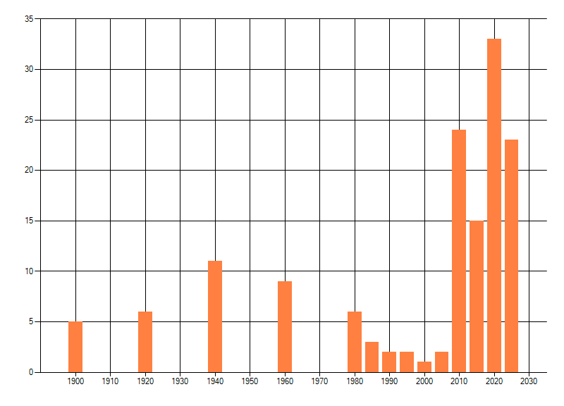 Het aantal atlasblokken (5x5 km) waarin de soort is gemeld binnen een periode van vijf jaar (vanaf 1980) of twintig jaar. Niet gecorrigeerd voor waarnemersinspanning en het aantal doorgegeven waarnemingen kan sterk variëren per periode, dus een trend in verspreiding kan hier niet direct uit worden afgelezen. Het opgegeven jaartal is het eerste jaar van de periode. Bron: gevalideerde waarnemingen uit de NDFF.