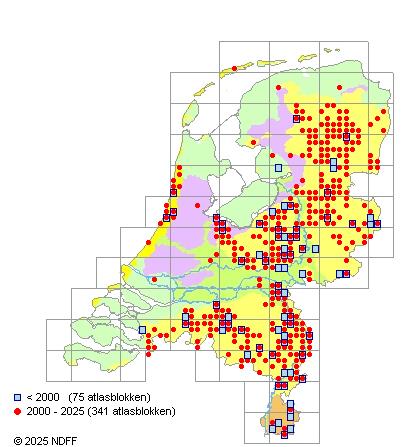 Het aantal atlasblokken (5x5 km) waarin de soort is gemeld binnen een periode van vijf jaar (vanaf 1980) of twintig jaar. Niet gecorrigeerd voor waarnemersinspanning en het aantal doorgegeven waarnemingen kan sterk variëren per periode, dus een trend in verspreiding kan hier niet direct uit worden afgelezen. Het opgegeven jaartal is het eerste jaar van de periode. Bron: gevalideerde waarnemingen uit de NDFF.