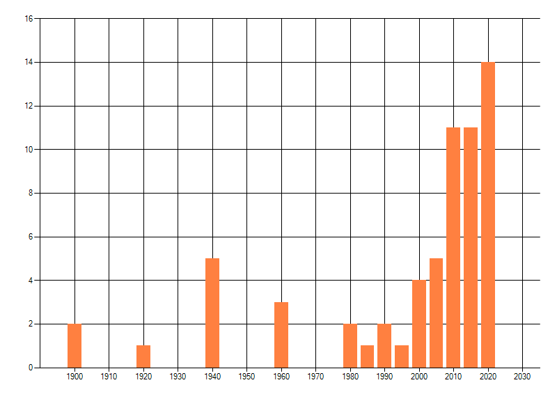 Het aantal atlasblokken (5x5 km) waarin de soort is gemeld binnen een periode van vijf jaar (vanaf 1980) of twintig jaar. Niet gecorrigeerd voor waarnemersinspanning en het aantal doorgegeven waarnemingen kan sterk variëren per periode, dus een trend in verspreiding kan hier niet direct uit worden afgelezen. Het opgegeven jaartal is het eerste jaar van de periode. Bron: gevalideerde waarnemingen uit de NDFF.