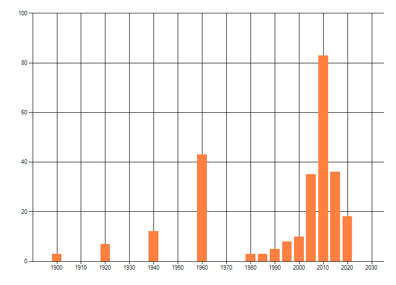 Het aantal atlasblokken (5x5 km) waarin de soort is gemeld binnen een periode van vijf jaar (vanaf 1980) of twintig jaar. Niet gecorrigeerd voor waarnemersinspanning en het aantal doorgegeven waarnemingen kan sterk variëren per periode, dus een trend in verspreiding kan hier niet direct uit worden afgelezen. Het opgegeven jaartal is het eerste jaar van de periode. Bron: gevalideerde waarnemingen uit de NDFF.