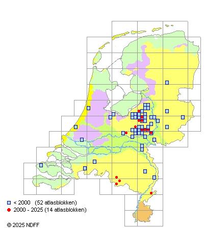Het aantal atlasblokken (5x5 km) waarin de soort is gemeld binnen een periode van vijf jaar (vanaf 1980) of twintig jaar. Niet gecorrigeerd voor waarnemersinspanning en het aantal doorgegeven waarnemingen kan sterk variëren per periode, dus een trend in verspreiding kan hier niet direct uit worden afgelezen. Het opgegeven jaartal is het eerste jaar van de periode. Bron: gevalideerde waarnemingen uit de NDFF.