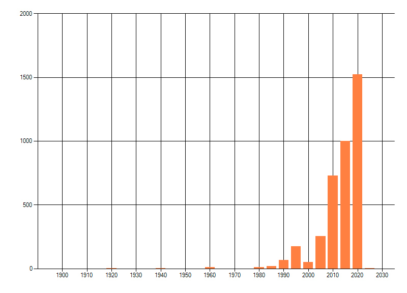 Het aantal atlasblokken (5x5 km) waarin de soort is gemeld binnen een periode van vijf jaar (vanaf 1980) of twintig jaar. Niet gecorrigeerd voor waarnemersinspanning en het aantal doorgegeven waarnemingen kan sterk variëren per periode, dus een trend in verspreiding kan hier niet direct uit worden afgelezen. Het opgegeven jaartal is het eerste jaar van de periode. Bron: gevalideerde waarnemingen uit de NDFF.