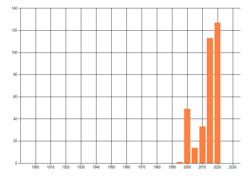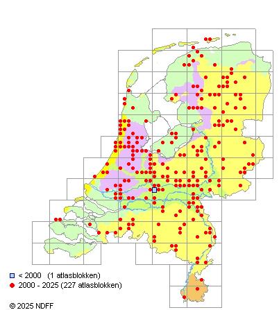 Het aantal atlasblokken (5x5 km) waarin de soort is gemeld binnen een periode van vijf jaar (vanaf 1980) of twintig jaar. Niet gecorrigeerd voor waarnemersinspanning en het aantal doorgegeven waarnemingen kan sterk variëren per periode, dus een trend in verspreiding kan hier niet direct uit worden afgelezen. Het opgegeven jaartal is het eerste jaar van de periode. Bron: gevalideerde waarnemingen uit de NDFF.