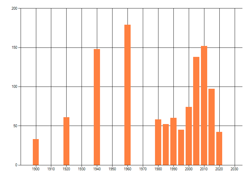 Het aantal atlasblokken (5x5 km) waarin de soort is gemeld binnen een periode van vijf jaar (vanaf 1980) of twintig jaar. Niet gecorrigeerd voor waarnemersinspanning en het aantal doorgegeven waarnemingen kan sterk variëren per periode, dus een trend in verspreiding kan hier niet direct uit worden afgelezen. Het opgegeven jaartal is het eerste jaar van de periode. Bron: gevalideerde waarnemingen uit de NDFF.