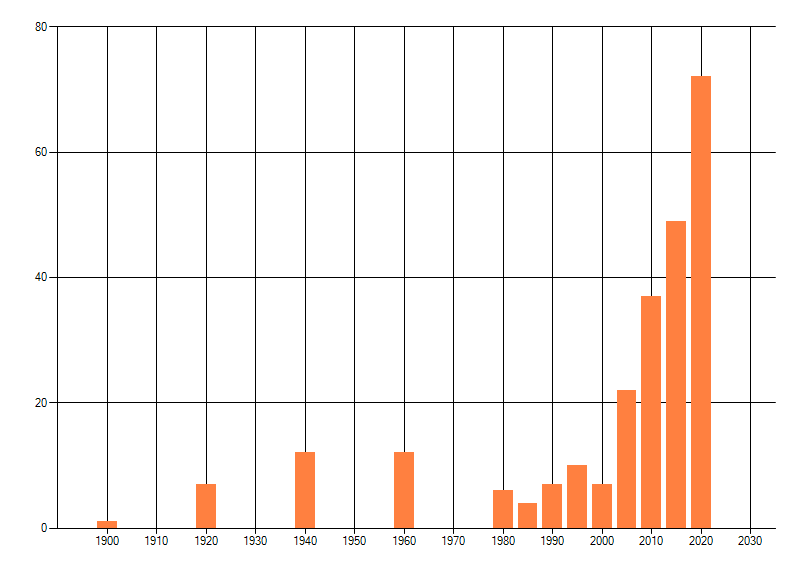 Het aantal atlasblokken (5x5 km) waarin de soort is gemeld binnen een periode van vijf jaar (vanaf 1980) of twintig jaar. Niet gecorrigeerd voor waarnemersinspanning en het aantal doorgegeven waarnemingen kan sterk variëren per periode, dus een trend in verspreiding kan hier niet direct uit worden afgelezen. Het opgegeven jaartal is het eerste jaar van de periode. Bron: gevalideerde waarnemingen uit de NDFF.