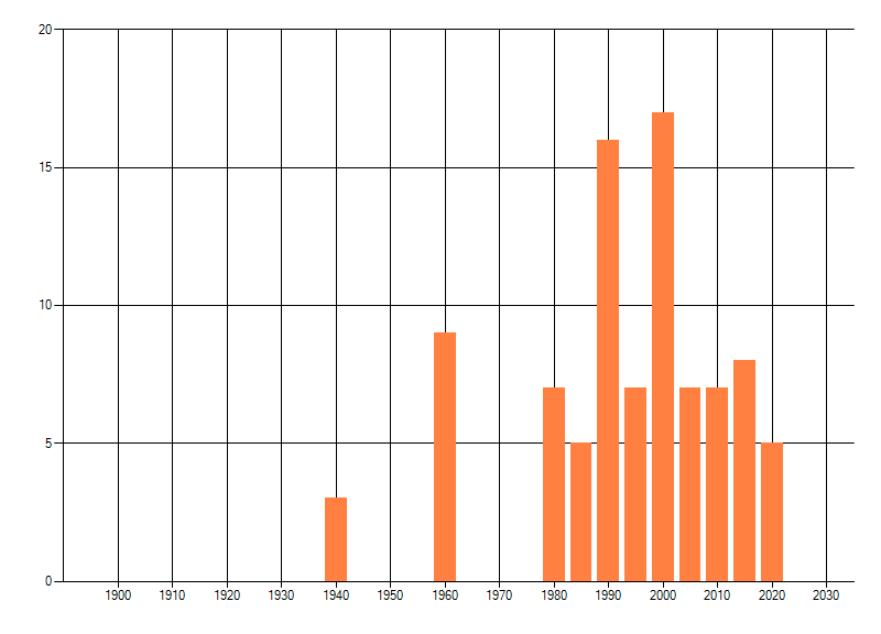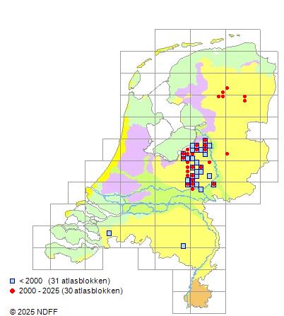 Het aantal atlasblokken (5x5 km) waarin de soort is gemeld binnen een periode van vijf jaar (vanaf 1980) of twintig jaar. Niet gecorrigeerd voor waarnemersinspanning en het aantal doorgegeven waarnemingen kan sterk variëren per periode, dus een trend in verspreiding kan hier niet direct uit worden afgelezen. Het opgegeven jaartal is het eerste jaar van de periode. Bron: gevalideerde waarnemingen uit de NDFF.