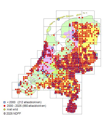 Het aantal atlasblokken (5x5 km) waarin de soort is gemeld binnen een periode van vijf jaar (vanaf 1980) of twintig jaar. Niet gecorrigeerd voor waarnemersinspanning en het aantal doorgegeven waarnemingen kan sterk variëren per periode, dus een trend in verspreiding kan hier niet direct uit worden afgelezen. Het opgegeven jaartal is het eerste jaar van de periode. Bron: gevalideerde waarnemingen uit de NDFF.