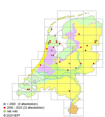 Het aantal atlasblokken (5x5 km) waarin de soort is gemeld binnen een periode van vijf jaar (vanaf 1980) of twintig jaar. Niet gecorrigeerd voor waarnemersinspanning en het aantal doorgegeven waarnemingen kan sterk variëren per periode, dus een trend in verspreiding kan hier niet direct uit worden afgelezen. Het opgegeven jaartal is het eerste jaar van de periode. Bron: gevalideerde waarnemingen uit de NDFF.