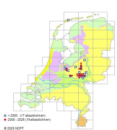 Het aantal atlasblokken (5x5 km) waarin de soort is gemeld binnen een periode van vijf jaar (vanaf 1980) of twintig jaar. Niet gecorrigeerd voor waarnemersinspanning en het aantal doorgegeven waarnemingen kan sterk variëren per periode, dus een trend in verspreiding kan hier niet direct uit worden afgelezen. Het opgegeven jaartal is het eerste jaar van de periode. Bron: gevalideerde waarnemingen uit de NDFF.
