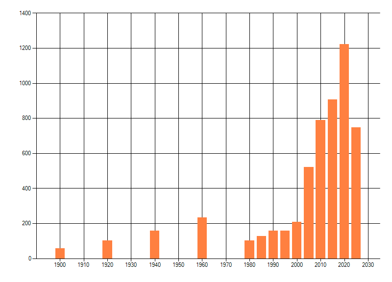 Het aantal atlasblokken (5x5 km) waarin de soort is gemeld binnen een periode van vijf jaar (vanaf 1980) of twintig jaar. Niet gecorrigeerd voor waarnemersinspanning en het aantal doorgegeven waarnemingen kan sterk variëren per periode, dus een trend in verspreiding kan hier niet direct uit worden afgelezen. Het opgegeven jaartal is het eerste jaar van de periode. Bron: gevalideerde waarnemingen uit de NDFF.