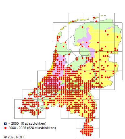 Het aantal atlasblokken (5x5 km) waarin de soort is gemeld binnen een periode van vijf jaar (vanaf 1980) of twintig jaar. Niet gecorrigeerd voor waarnemersinspanning en het aantal doorgegeven waarnemingen kan sterk variëren per periode, dus een trend in verspreiding kan hier niet direct uit worden afgelezen. Het opgegeven jaartal is het eerste jaar van de periode. Bron: gevalideerde waarnemingen uit de NDFF.