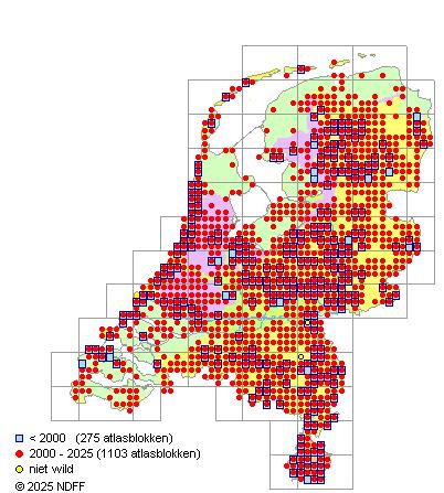 Het aantal atlasblokken (5x5 km) waarin de soort is gemeld binnen een periode van vijf jaar (vanaf 1980) of twintig jaar. Niet gecorrigeerd voor waarnemersinspanning en het aantal doorgegeven waarnemingen kan sterk variëren per periode, dus een trend in verspreiding kan hier niet direct uit worden afgelezen. Het opgegeven jaartal is het eerste jaar van de periode. Bron: gevalideerde waarnemingen uit de NDFF.