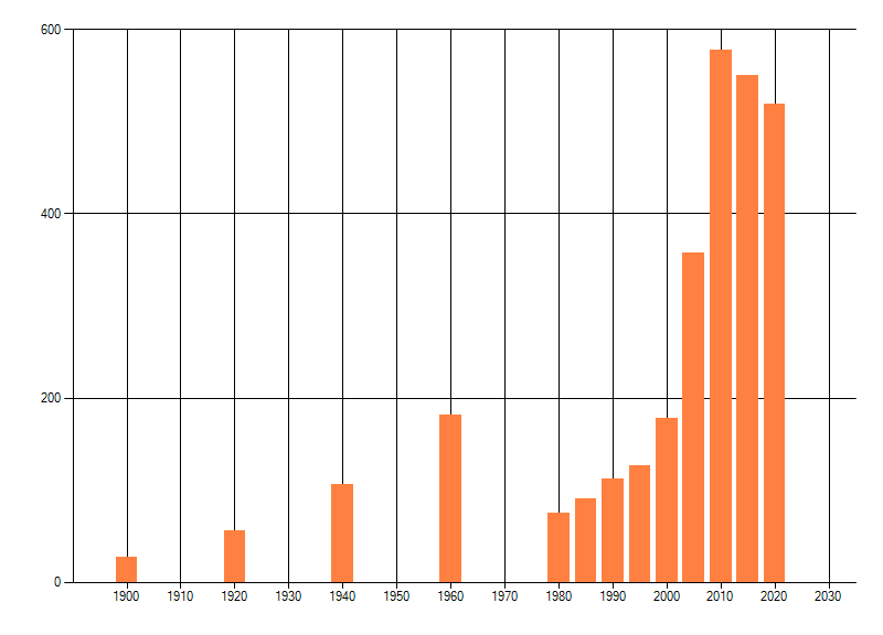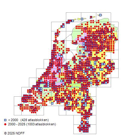 Het aantal atlasblokken (5x5 km) waarin de soort is gemeld binnen een periode van vijf jaar (vanaf 1980) of twintig jaar. Niet gecorrigeerd voor waarnemersinspanning en het aantal doorgegeven waarnemingen kan sterk variëren per periode, dus een trend in verspreiding kan hier niet direct uit worden afgelezen. Het opgegeven jaartal is het eerste jaar van de periode. Bron: gevalideerde waarnemingen uit de NDFF.