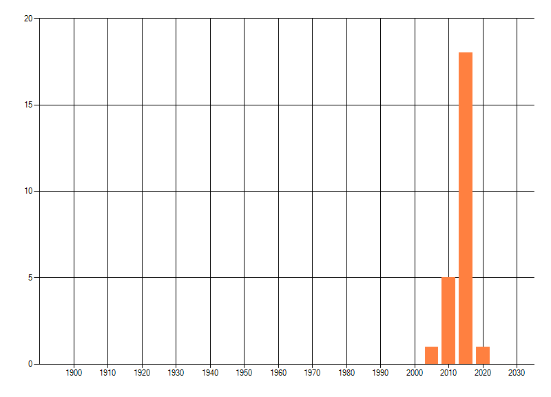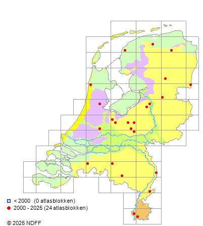 Het aantal atlasblokken (5x5 km) waarin de soort is gemeld binnen een periode van vijf jaar (vanaf 1980) of twintig jaar. Niet gecorrigeerd voor waarnemersinspanning en het aantal doorgegeven waarnemingen kan sterk variëren per periode, dus een trend in verspreiding kan hier niet direct uit worden afgelezen. Het opgegeven jaartal is het eerste jaar van de periode. Bron: gevalideerde waarnemingen uit de NDFF.