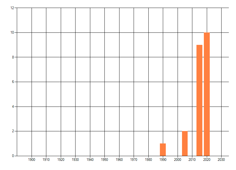 Het aantal atlasblokken (5x5 km) waarin de soort is gemeld binnen een periode van vijf jaar (vanaf 1980) of twintig jaar. Niet gecorrigeerd voor waarnemersinspanning en het aantal doorgegeven waarnemingen kan sterk variëren per periode, dus een trend in verspreiding kan hier niet direct uit worden afgelezen. Het opgegeven jaartal is het eerste jaar van de periode. Bron: gevalideerde waarnemingen uit de NDFF.