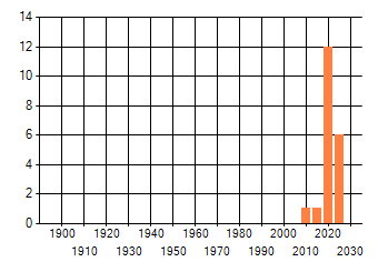 Het aantal atlasblokken (5x5 km) waarin de soort is gemeld binnen een periode van vijf jaar (vanaf 1980) of twintig jaar. Niet gecorrigeerd voor waarnemersinspanning en het aantal doorgegeven waarnemingen kan sterk variëren per periode, dus een trend in verspreiding kan hier niet direct uit worden afgelezen. Het opgegeven jaartal is het eerste jaar van de periode. Bron: gevalideerde waarnemingen uit de NDFF.