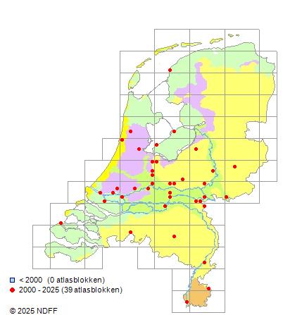 Het aantal atlasblokken (5x5 km) waarin de soort is gemeld binnen een periode van vijf jaar (vanaf 1980) of twintig jaar. Niet gecorrigeerd voor waarnemersinspanning en het aantal doorgegeven waarnemingen kan sterk variëren per periode, dus een trend in verspreiding kan hier niet direct uit worden afgelezen. Het opgegeven jaartal is het eerste jaar van de periode. Bron: gevalideerde waarnemingen uit de NDFF.