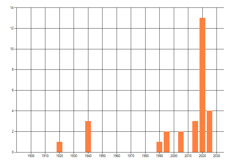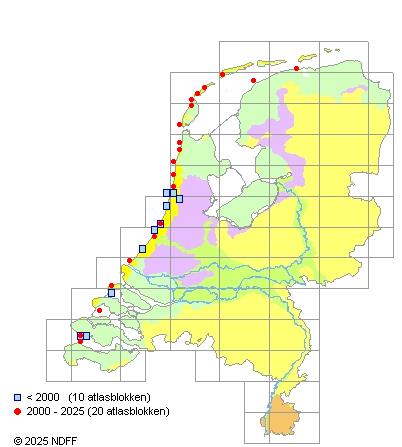 Het aantal atlasblokken (5x5 km) waarin de soort is gemeld binnen een periode van vijf jaar (vanaf 1980) of twintig jaar. Niet gecorrigeerd voor waarnemersinspanning en het aantal doorgegeven waarnemingen kan sterk variëren per periode, dus een trend in verspreiding kan hier niet direct uit worden afgelezen. Het opgegeven jaartal is het eerste jaar van de periode. Bron: gevalideerde waarnemingen uit de NDFF.